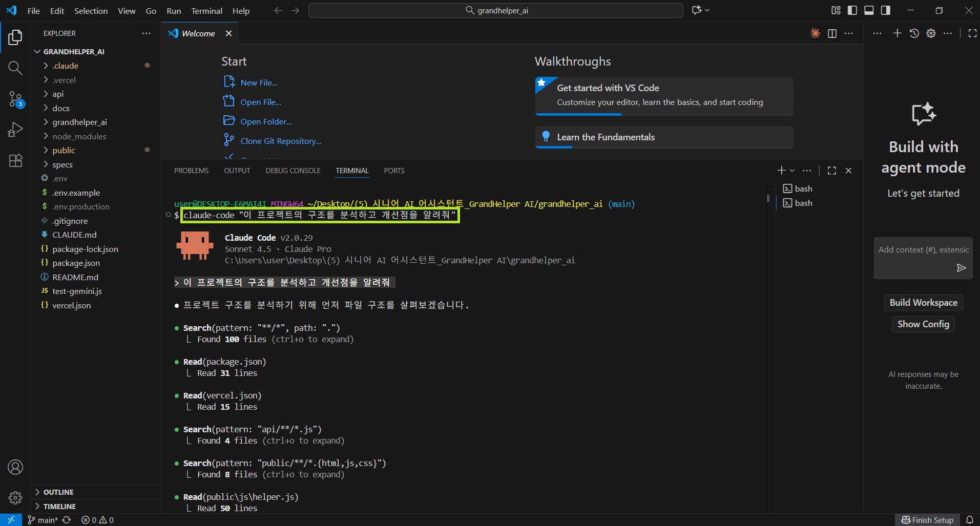 (3) VS Code & Claude Code 연동 개발환경 스크린샷: Claude Dev Tools 설치 후에는 claude-code "이 프로젝트의 구조를 분석하고 개선점을 알려줘"와 같은 프롬프트 입력만으로 클로드 코드봇이 등장, 신속하고 쉽게 문제를 해결합니다.