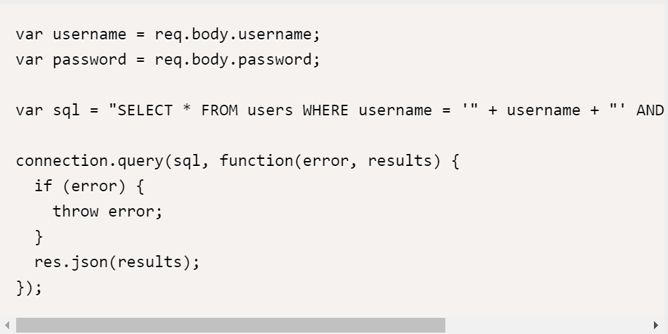 SQL 삽입(SQL Injection)이란, 사용자가 입력한 값이 악의적인 SQL 쿼리로 실행될 수 있는 것을 말한다. 위의 코드에서는 username과 password 값을 직접 SQL 쿼리에 포함시키고 있기 때문에, 악의적인 사용자가 입력한 값에 SQL 쿼리를 포함시키면 원하지 않는 결과가 발생할 수 있다.