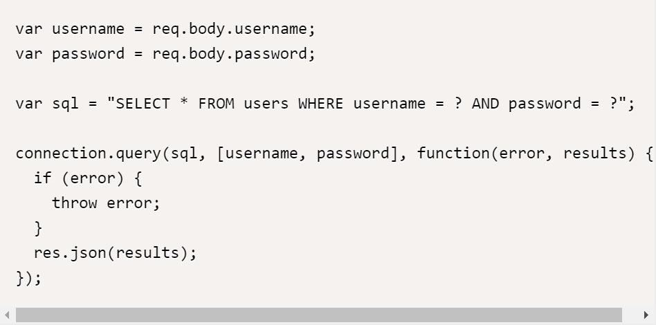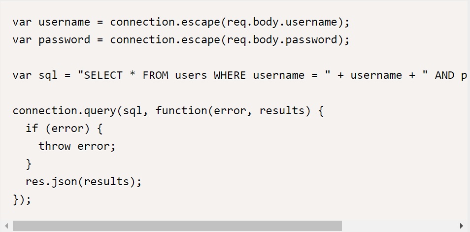 위의 코드에서, connection.escape 메서드를 사용하여 username과 password 값을 이스케이프(escape)한다. 이스케이프된 값은 SQL 쿼리에 안전하게 포함될 수 있다.
