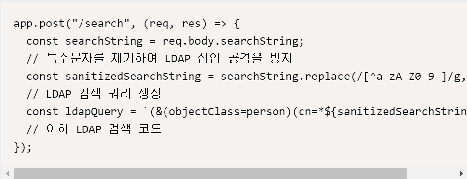LDAP 삽입 문제를 방지하기 위해서는 입력 데이터를 적절하게 검증하는 것이 중요하다. 다음 예시 코드는 LDAP 검색 쿼리를 생성할 때, 특수문자를 제거하는 검증 코드이다.
