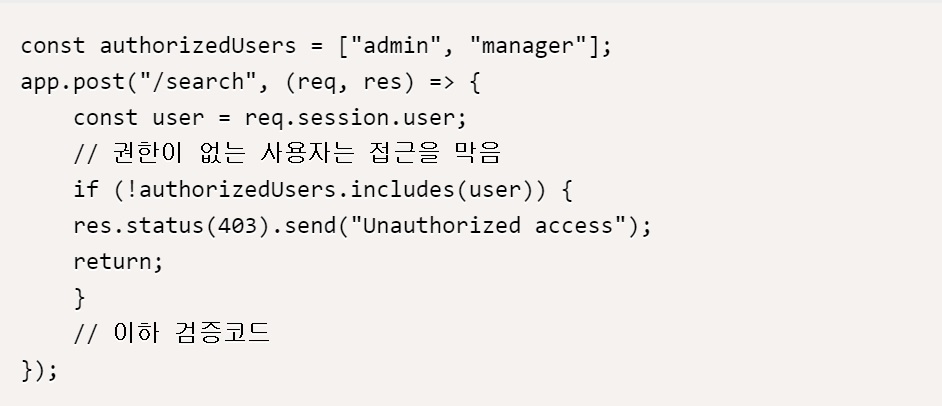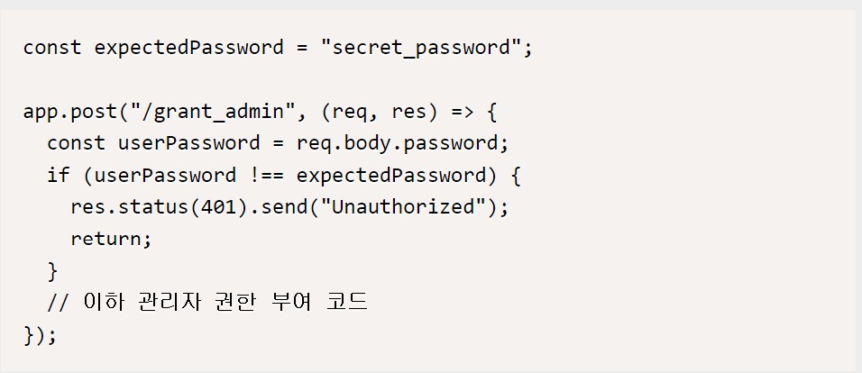 위 코드에서, 사용자가 요청한 패스워드(userPassword)가 예상하는 패스워드(expectedPassword)와 일치하지 않는다면, 401 Unauthorized 상태 코드와 “Unauthorized” 메시지를 보낸다. 이처럼 예상하지 않은 값이 제출될 경우 적절한 오류 메시지와 상태 코드를 보내는 것이 중요하다. 이를 통해 부적절한 입력에 대한 공격을 막을 수 있다.