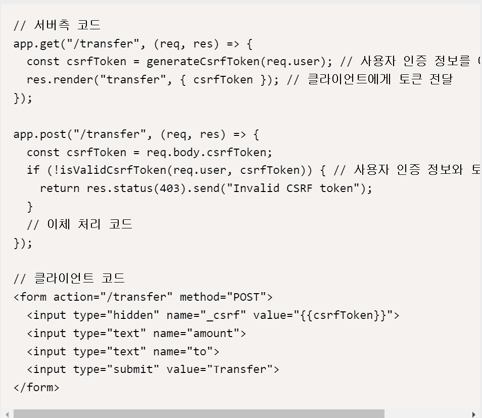 서버측 코드에서는 generateCsrfToken 함수를 이용해 사용자 인증 정보를 기반으로 CSRF 토큰을 생성하고, 이를 클라이언트에 전달한다. 그리고 클라이언트로부터 전달받은 토큰과 사용자 인증 정보를 기반으로 isValidCsrfToken 함수를 이용해 토큰의 유효성을 검사한다.