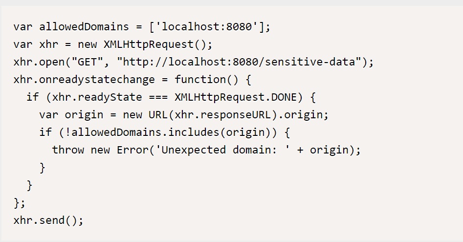 위의 코드에서, allowedDomains 변수는 신뢰할 수 있는 도메인의 목록이다. xhr.responseURL은 실제로 수신된 응답의 URL을 나타낸다. 요청이 수신된 후, 응답의 URL의 출처(origin)이 허용된 도메인의 목록에 포함되어 있는지 확인한다. 응답의 URL이 허용된 도메인의 목록에 포함되어 있지 않은 경우, 애플리케이션은 예외를 발생시킨다.