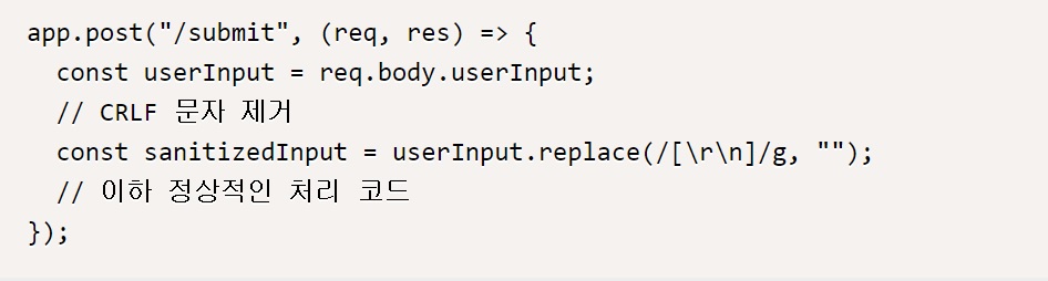 다음 예시 코드는 사용자 입력 데이터에서 CRLF문자를 제거하는 검증 코드이다.