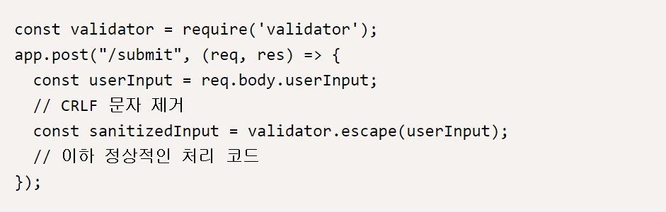 요청 파라미터의 값을 HTTP 응답헤더(예를 들어, Set-Cookie 등)에 포함시킬 경우 CR(\r), LF(\n)와 같은 개행문자를 제거한다. 외부 입력값이 헤더, 쿠키, 로그등에 사용될 경우에는 항상 개행 문자를 검증하고 헤더에 사용되는 예약어 등은 가능하다면 화이트리스트로 제한해야 한다.