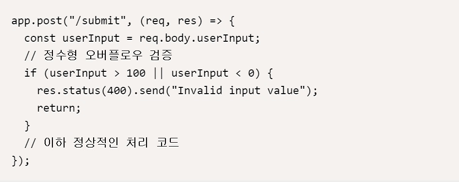 여기서, userInput이 0보다 작거나 100보다 크다면 400 Bad Request 상태 코드와 함께 “Invalid input value” 메시지를 보내 사용자에게 알려주고 처리를 중단한다.