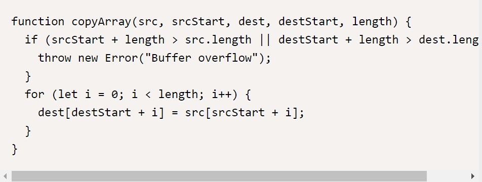 여기서, srcStart + length 가 src 배열의 길이보다 크거나, destStart + length 가 dest 배열의 길이보다 크다면 Error 객체를 생성하여 “Buffer overflow” 메시지를 보내 오버플로우가 발생했음을 알려준다. 이외에는 정상적인 배열 복사 처리를 한다.