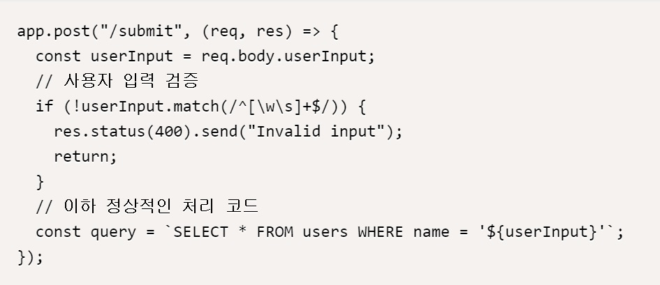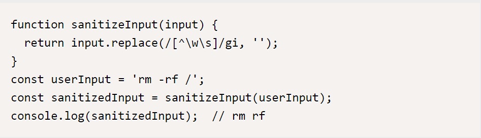 위 코드에서 sanitizeInput 함수는 사용자 입력 데이터에서 특수 문자를 제거하는 기능을 가진다. 이 함수를 통해 정제된 데이터는 운영체제 명령어로 실행되지 않는다.