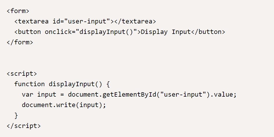 이 코드는 사용자에게 이름을 입력받아 환영 메시지를 표시한다. 하지만, 악의적인 사용자가 다음과 같은 스크립트를 입력할 경우