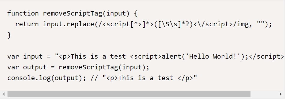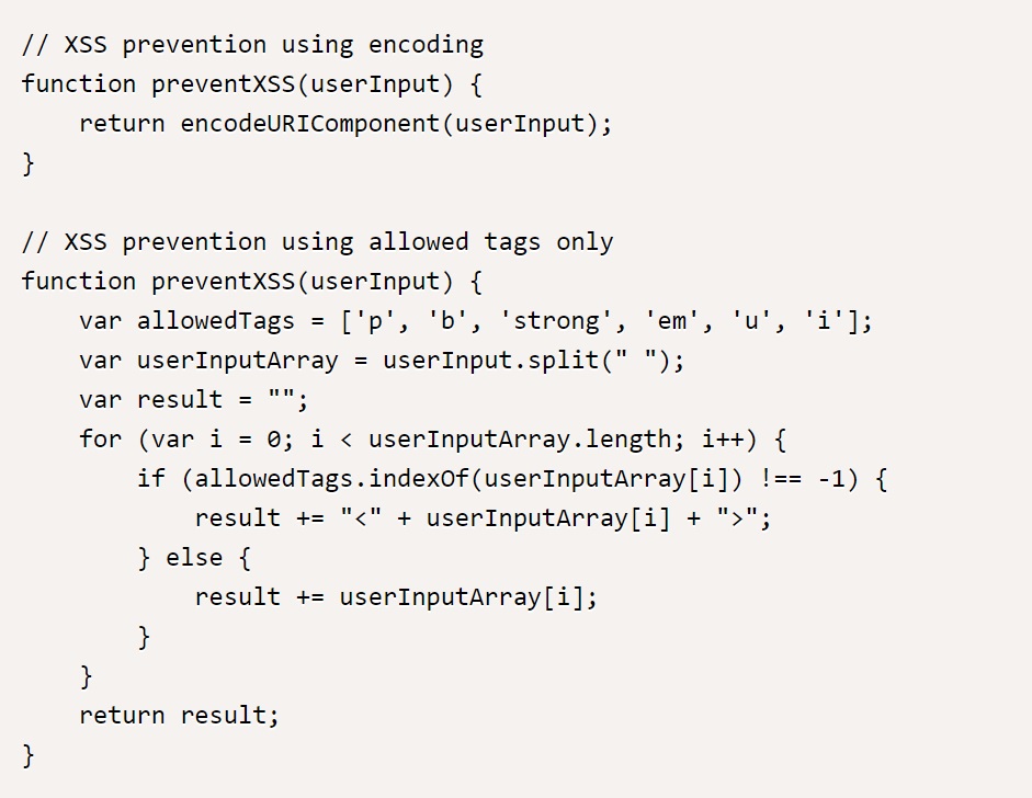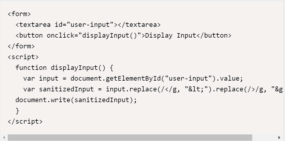 외부 소스에서 악의적인 코드를 삽입하여 웹 사이트를 악용하는 문제를 방지하기 위해서는 외부 입력을 정제하는 과정을 거쳐야 한다. 예를 들어, 웹 폼에서 사용자가 입력한 값을 그대로 출력하는 경우 아래와 같은 코드를 사용할 수 있다.