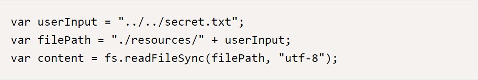 위 코드에서 userInput 변수에 사용자가 입력한 값을 사용하여 파일 경로를 생성하고, fs.readFileSync 함수를 사용하여 파일을 읽어오고 있다. 하지만 이러한 방식은 악의적인 사용자가 userInput에 “../” 등의 경로 조작 구문을 입력하여 시스템의 다른 경로에 있는 민감한 파일을 읽어오는 것을 막지 못하기 때문에 보안 취약점이 될 수 있다. 이러한 보안 취약점을 방지하려면, 사용자 입력에 대한 검증이 필요하며, 특정 경로만 접근 가능하도록 제한할 수 있다.