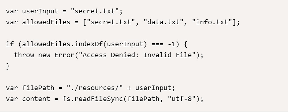 위 코드에서, 사용자 입력인 userInput을 허용된 파일 목록인 allowedFiles와 비교하여 허용된 파일인지 확인하고 있다. 허용되지 않은 파일인 경우, 예외를 발생시키고 액세스를 거부한다. 허용된 파일인 경우에만 경로를 생성하여 파일을 읽어온다. 이렇게 하면, 악의적인 사용자가 경로 조작 구문을 입력하여 다른 경로에 있는 민감한 파일에 접근하는 것을 막을 수 있다.