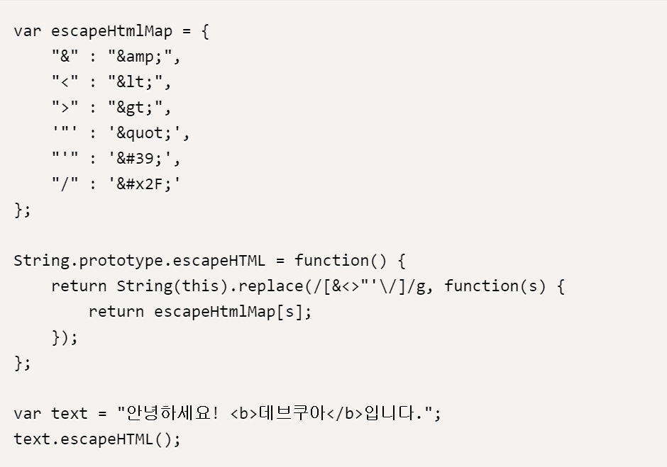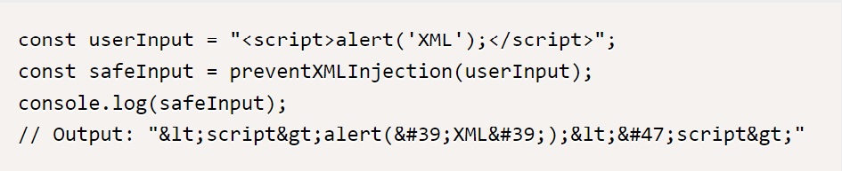 위 코드는 사용자 입력을 받아 특수 문자를 HTML 엔티티로 변환하는 함수를 제공한다. 이렇게 하면 <, >, &, ” 문자가 입력될 경우 원래의 문자로 인식되지 않아 XML 삽입 공격을 방지할 수 있다.