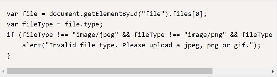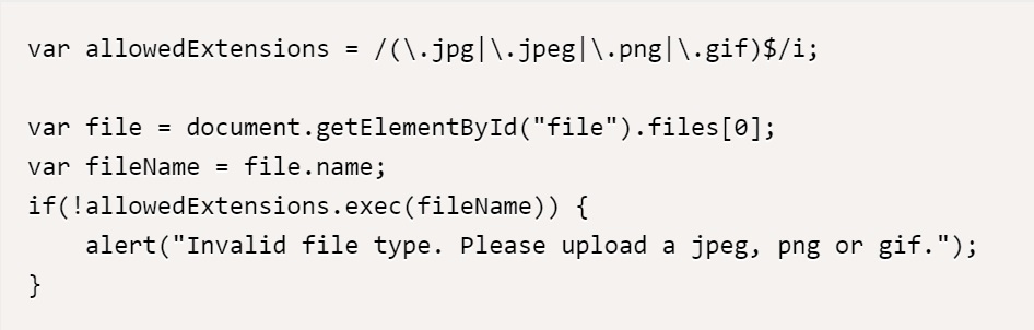 JavaScript로 개발시 위험한 형식 파일 업로드를 방지하는 방법 중 하나는 파일 확장자를 검사하는 것이다. 예를 들어, 허용하려는 확장자만 허용하는 경우 아래와 같은 코드를 사용할 수 있다.