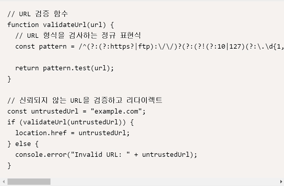 위의 코드에서 URL의 유효성을 검사하기 위해 validateUrl 함수가 정의되어 있다. validateUrl 함수는 주어진 URL을 검사하기 위해 정규 표현식(regular expression)을 사용한다. 정규 표현식은 URL이 적절한 형식을 가지고 있는지 검사한다. URL이 유효하다면, 코드에서 location.href 값을 URL로 설정하여 리다이렉트한다. 만약 URL이 유효하지 않다면, 코드에서 console.error 함수를 사용하여 오류 메시지를 표시한다. 이러한 방식으로 신뢰되지 않는 URL을 검증하고 리다이렉트하는 과정에서 보안 문제를 최소화할 수 있다.