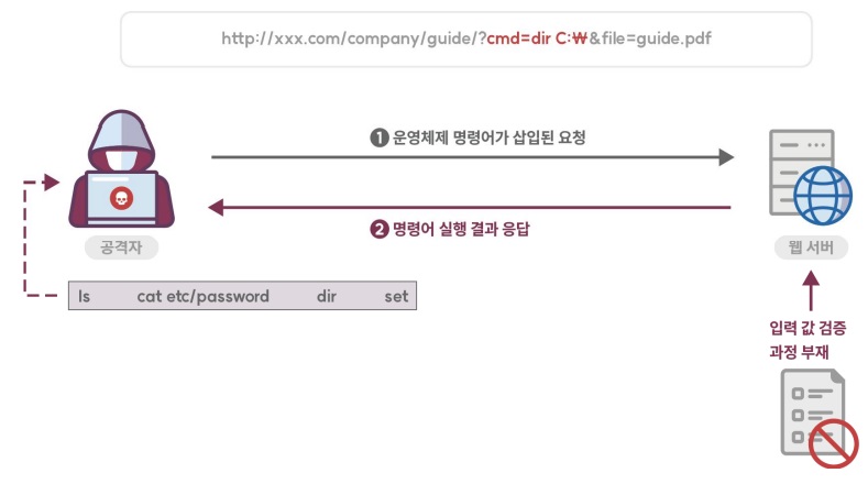적절한 검증 절차를 거치지 않은 사용자 입력값이 운영체제 명령어의 일부 또는 전부로 구성되어 실행되는 경우, 의도하지 않은 시스템 명령어가 실행돼 부적절하게 권한이 변경되거나 시스템 동작 및 운영에 악영향을 미칠 수 있다. 명령어 라인의 파라미터나 스트림 입력 등 외부 입력을 사용해 시스템 명령어를 생성 하는 프로그램을 많이 찾아볼 수 있다. 이 경우 프로그램 외부로부터 받은 입력 문자열은 기본적으로 신뢰할 수 없기 때문에 적절한 처리를 해주지 않으면 공격으로 이어질 수 있다.