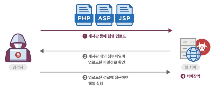 서버 측에서 실행될 수 있는 스크립트 파일(asp, jsp, php, sh 파일 등)이 업로드 가능하고, 이 파일을 공격자가 웹을 통해 직접 실행시킬 수 있는 경우, 시스템 내부명령어를 실행하거나 외부와 연결하여 시스템을 제어할 수 있는 보안약점이다.
