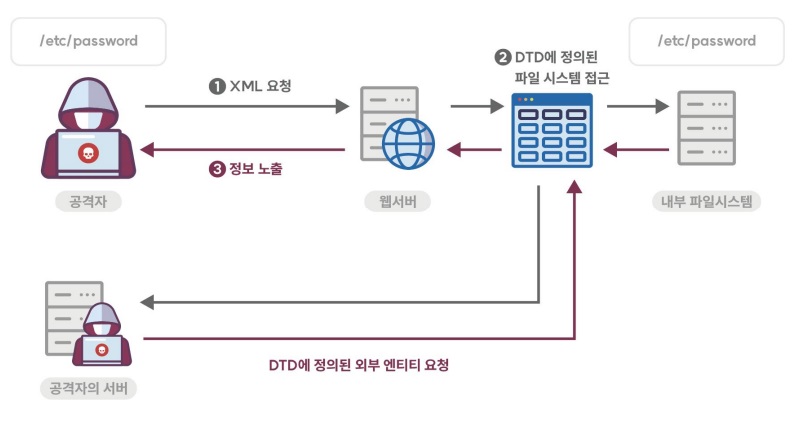 XML 문서에는 DTD(DocumentTypeDefinition)를 포함할 수 있으며, DTD는 XML 엔티티(entitiy)를 정의한다. 부적절한 XML 외부개체 참조 보안약점은 서버에서 XML 외부엔티티를 처리할 수 있도록 설정된 경우에 발생할 수 있다. 취약한 XML parser가 외부 값을 참조하는 XML 값을 처리할 때, 공격자가 삽입한 공격 구문이 동작되어 서버 파일 접근, 불필요한 자원 사용, 인증 우회, 정보 노출 등이 발생할 수 있다.