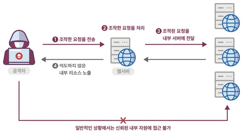 적절한 검증절차를 거치지 않은 사용자 입력값을 서버간의 요청에 사용하여 악의적인 행위가 발생할 수 있는 보안약점이다. 외부에 노출된 웹 서버에 취약한 애플리케이션이 존재하는 경우 공격자는 URL 또는 요청문을 위조하여 접근통제를 우회하는 방식으로 비정상적인 동작을 유도하거나 신뢰된 네트워크에 있는 데이터를 획득할 수 있다.