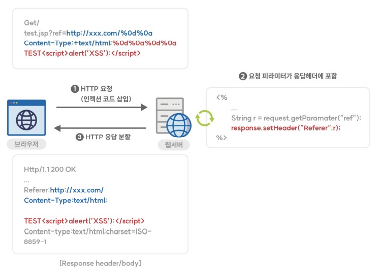 HTTP 요청에 들어 있는 파라미터(Parameter)가 HTTP 응답헤더에 포함되어 사용자에게 다시 전달될 때, 입력값에 CR(CarriageReturn)이나 LF(LineFeed)와 같은 개행문자가 존재하면 HTTP 응답이 2개 이상으로 분리될 수 있다. 이 경우 공격자는 개행문자를 이용하여 첫 번째 응답을 종료 시키고, 두 번째 응답에 악의적인 코드를 주입하여 XSS 및 캐시훼손(CachePoisoning) 공격 등을 수행할 수 있다. HTTP 응답분할 공격으로부터 어플리케이션을 안전하게 지키려면 최신 버전의 라이브러리, 프레임 워크를 사용하고 외부 입력값에 대해서는 철저한 검증 작업을 수행해야 한다.