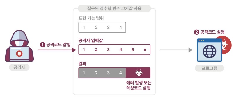 정수형 오버플로우는 정수형 크기가 고정된 상태에서 변수가 저장할 수 있는 범위를 넘어선 값을 저장하려 할 때 실제 저장되는 값이 의도치 않게 아주 작은 수 또는 음수가 되어 프로그램이 예기치 않게 동작하게 되는 취약점이다. 특히 반복문 제어, 메모리 할당, 메모리 복사 등을 위한 조건으로 사용자가 제공하는 입력값을 사용하고 그 과정에서 정수형 오버플로우가 발생하는 경우 보안상 문제를 유발할 수 있다.