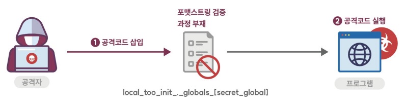 외부로부터 입력된 값을 검증하지 않고 입·출력 함수의 포맷 문자열로 그대로 사용하는 경우 발생할 수 있는 보안약점이다. 공격자는 포맷 문자열을 이용하여 취약한 프로세스를 공격하거나 메모리 내용을 읽거나 쓸 수 있다. 그 결과, 공격자는 취약한 프로세스의 권한을 취득하여 임의의 코드를 실행할 수 있다. 공격자는 포맷 문자열을 이용하여 내부 정보를 문자열로 만들 수 있으며, 이를 반환하는 경우 내부의 중요 정보가 유출될 수 있다.